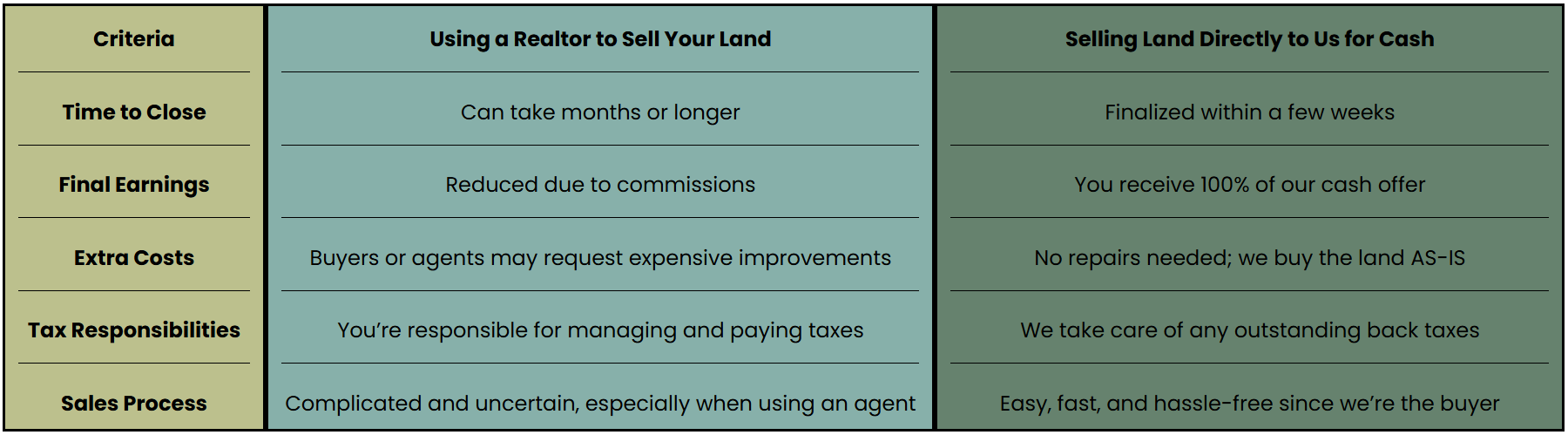 Willow Land Company Why Sell Your Land to Willow Land Company? Selling land doesn’t have to be stressful. Here’s why smart landowners choose us: Fair Cash Offers Get a fast, fair offer based on your land’s current value. No Fees or Commissions Working with us won’t cost you a penny. As-Is Purchases We buy land in any condition—no improvements needed. Fast Closing Close in weeks, not months. Willow Land Company Our Four-Step Process Request an Offer Submit your property details. Review Contract If your property meets our criteria, we will send over a purchase agreement. Due Diligence We will handle the paperwork and resolve any issues. Get Paid Receive your cash and enjoy peace of mind. Willow Land Company Comparison Chart Criteria Time to Close Final Earnings Extra Costs Tax Responsibilities Sales Process Using a Realtor to Sell Your Land Can take months or longer Reduced due to commissions Buyers or agents may request expensive improvements You’re responsible for managing and paying taxes Complicated and uncertain, especially when using an agent Selling Land Directly to Us for Cash Finalized within a few weeks You receive 100% of our cash offer No repairs needed; we buy the land AS-IS We take care of any outstanding back taxes Easy, fast, and hassle-free since we’re the buyer *Back taxes deducted from the closing amount. Sellers are responsible if back taxes exceed the offer. Request your fast cash offer today and let us show you how smooth and easy selling your land can be. Get My Fair Cash Offer Now